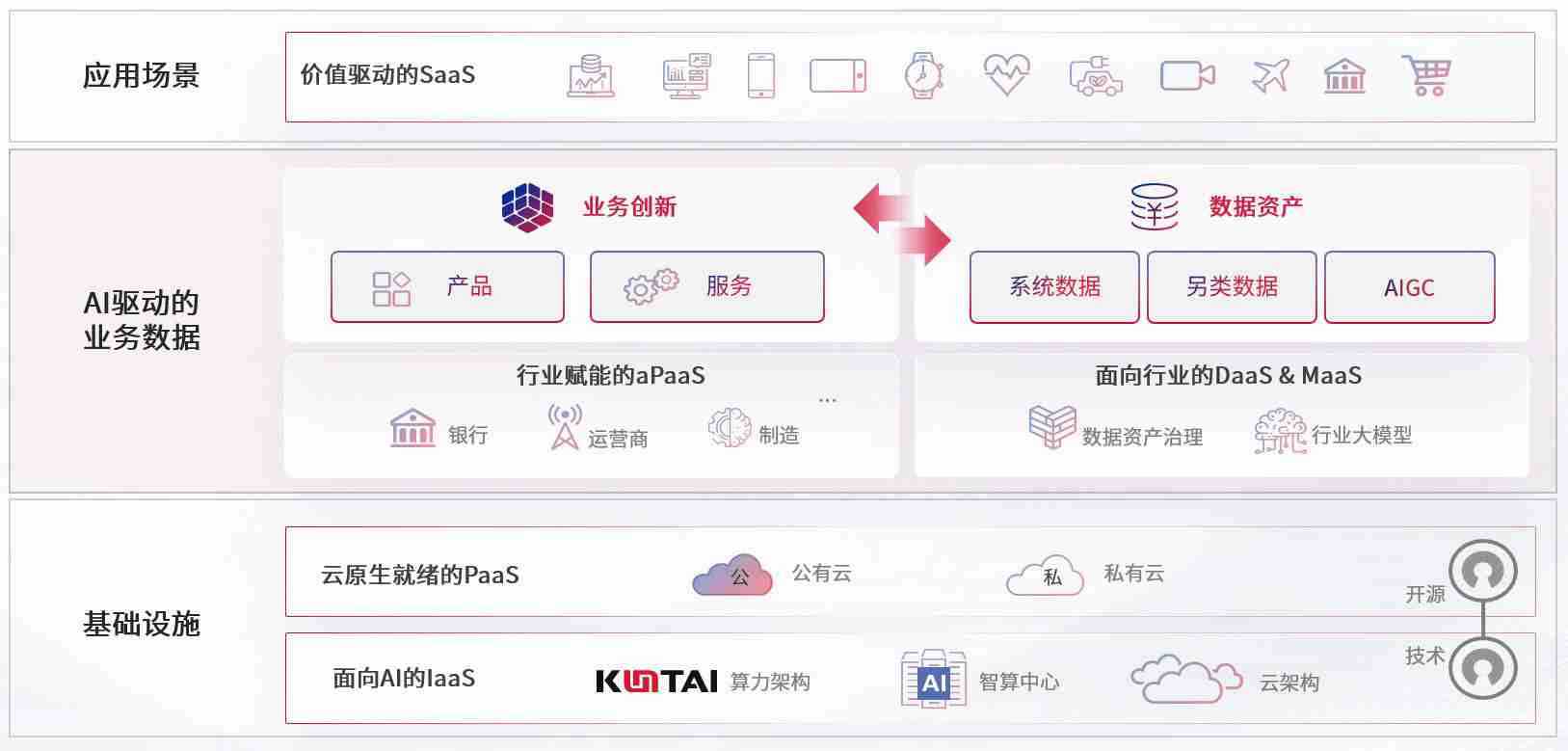数字时代,,,,围绕企业数字化转型的关键要素,,壹号娱乐数码开创性的提出数云融合战略和技术体系框架,,,着力在云原生、、数字原生、、AI原生和信创产业上架构产品和服务能力,,,,为处在不同数字化转型阶段的快消零售、、、汽车、、金融、、、医疗、、、政企、、、、教育、、运营商等行业客户提供泛在的敏捷IT能力和融合的数据驱动能力,,,构建跨界融合创新的数字业务场景和新业务模式,,助力企业级客户建立面向未来的核心能力和竞争优势,,,全面推动社会的数字化、、、、智能化转型升级。。