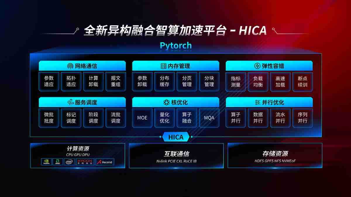 通过自研的服务层、、、、中间适配层、、以及调度编排算法,,,采用数据并行、、模型并行等多种并行方式,,,,把并行计算任务进行有效的分解,,使其分别由相应的软件栈和算力资源来承接。。当GPU资源变化,,HICA可以实时动态调度计算子任务并调整模型拓扑和架构,,以充分聚合各种算力资源。。