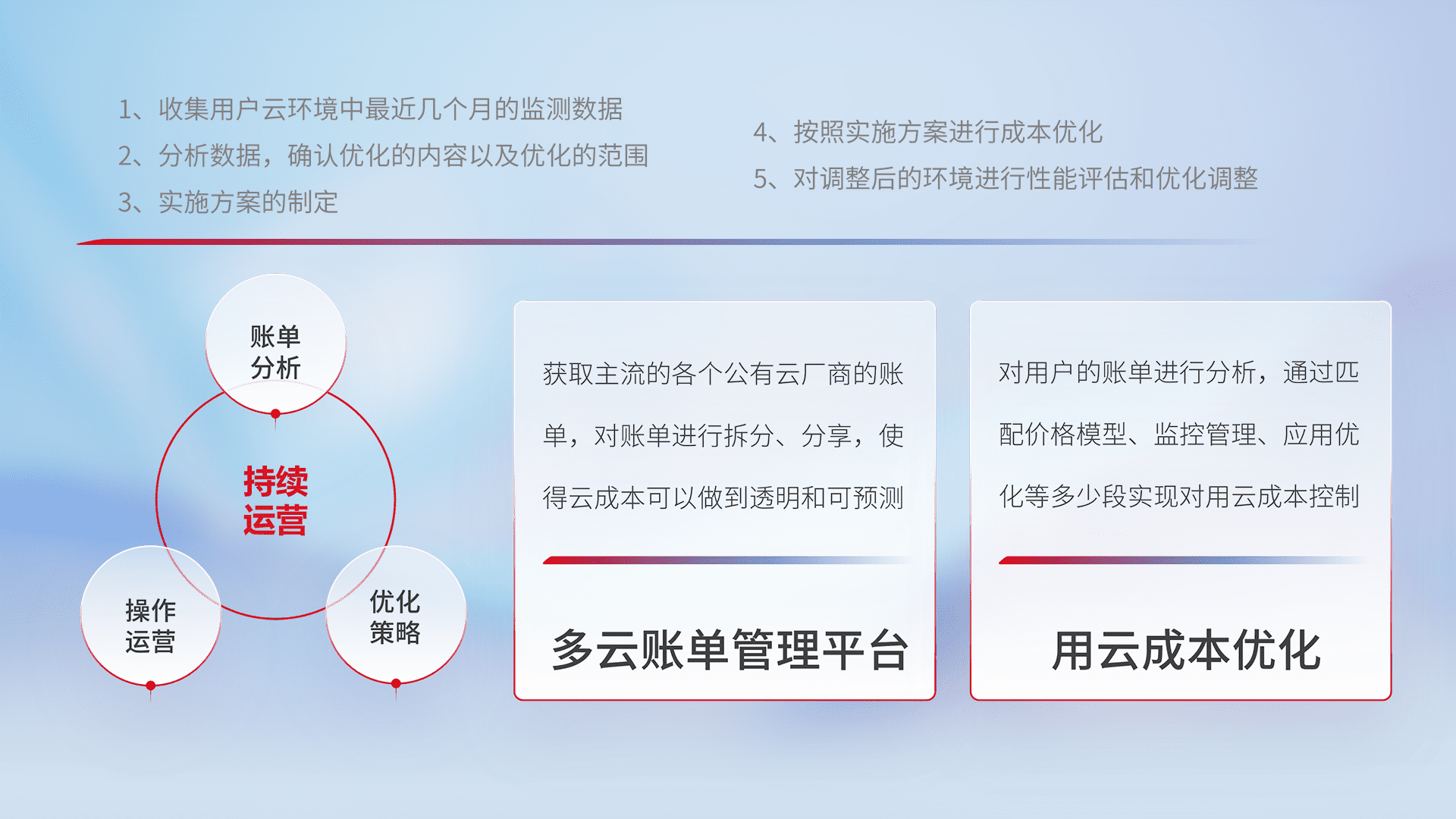 通过多云纳管,,,,以统一的资源数据模型把客户的云资源进行抽象和封装,,进而实现对多云资源的统一操作,,,,保障云资源管理的可靠性、、稳定性与可用性。。量身定制化运维内容,,配置、、、、开发运维、、、补丁管理、、、、备份、、监控、、、认证和访问管理、、、审计和日常巡检等,,,保障在用云过程中的可靠度,,,稳定度以及高可用率。。。。